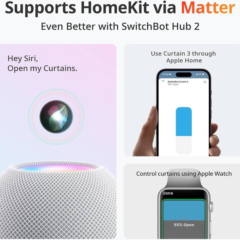 Supports Matter: With SwitchBot Hub 2 (sold separately), Curtain 3 supports Matter and can be integrated with Apple HomeKit. Control your curtains via the Home App or using your HomePod/Apple Watch. You can also use with other SwitchBot devices for better automation and scene control.